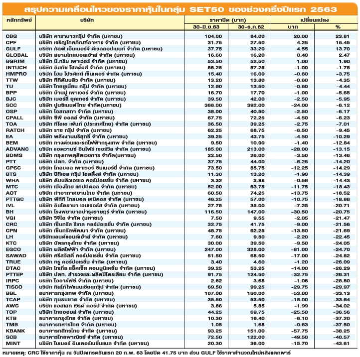 ดังนั้นทำให้เกิดแรงเทขายหุ้นในตลาดหลักทรัพย์ฯ เพื่อลดความเสี่ยงออกมาในช่วงครึ่งปีแรก 2563 แม้กระทั่งหุ้นขนาดใหญ่อย่างกลุ่ม SET50 ที่มีพื้นฐานแข็งแกร่งก็ไม่เว้นต่างก็ปรับตัวลง และกระทบต่อภาพรวมของดัชนี SET50 ช่วงครึ่งปีแรก 2563 ปรับตัวลง 183.35 จุด หรือลงไป 17.15%