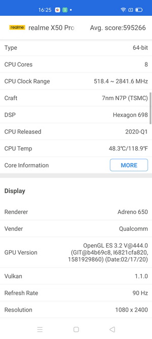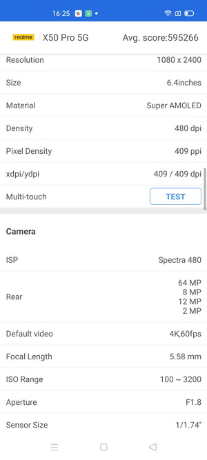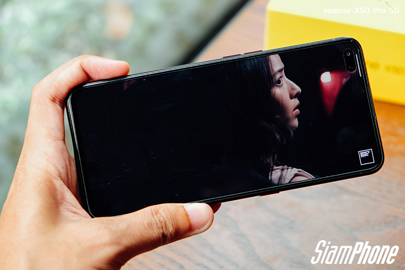 realme X50 Pro 5G มาพร้อมกับหน้าจอ Super AMOLED ขนาด 6.44 นิ้ว ความละเอียด Full HD+ เป็นหน้าจอแบบ Dual Punch-Hole ซึ่งคุ้นเคยกันดี มีอัตราส่วนของหน้าจออยู่ที่ 20:9 รองรับการแสดงผล HDR10+ บวกกับความสว่างสูงสุด 1000+nit และขอบเขตสีกว้าง DCI-P3 ด้วย เรียกได้ว่าทั้งชัดเจน สีสันสมจริง ไม่ต้องกังวลแม้ใช้งานกลางแสงจ้า