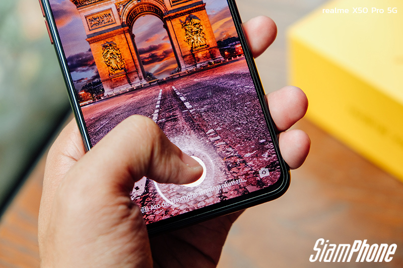 เซ็นเซอร์สแกนลายนิ้วมือที่อยู่ใต้หน้าจอ แม้จะไม่ใช้เทคโนโลยีใหม่อะไร แต่ใน realme X50 Pro 5G ก็จัดมาให้เพื่อความสะดวกสบายในการปลดล็อค โดยทาง realme ออกมาเคลมเองเลยว่าสามารถสแกนลายนิ้วมือได้อย่างรวดเร็ว ใช้เวลาเพียง 0.27 วินาทีเท่านั้น และยังเลือกเอฟเฟคต่างๆ ได้ตามสไตล์เราอีกด้วย