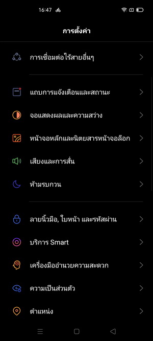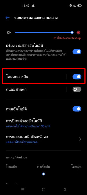 สำหรับ realme X50 Pro 5G สามารถเปิดใช้งานโหมดกลางคืน (Dark Mode) ซึ่งเป็นการปรับสีของหน้าจอให้อยู่ในโหมดมืด ช่วยให้สบายตาเมื่อต้องการใช้งานในที่มืดหรือแสงน้อย หรือบางคนก็ชอบเปิด เพราะช่วยถนอมสายตา ลดความเมื่อยล้าเมื่อต้องจ้องหน้าจอเป็นเวลานานๆ